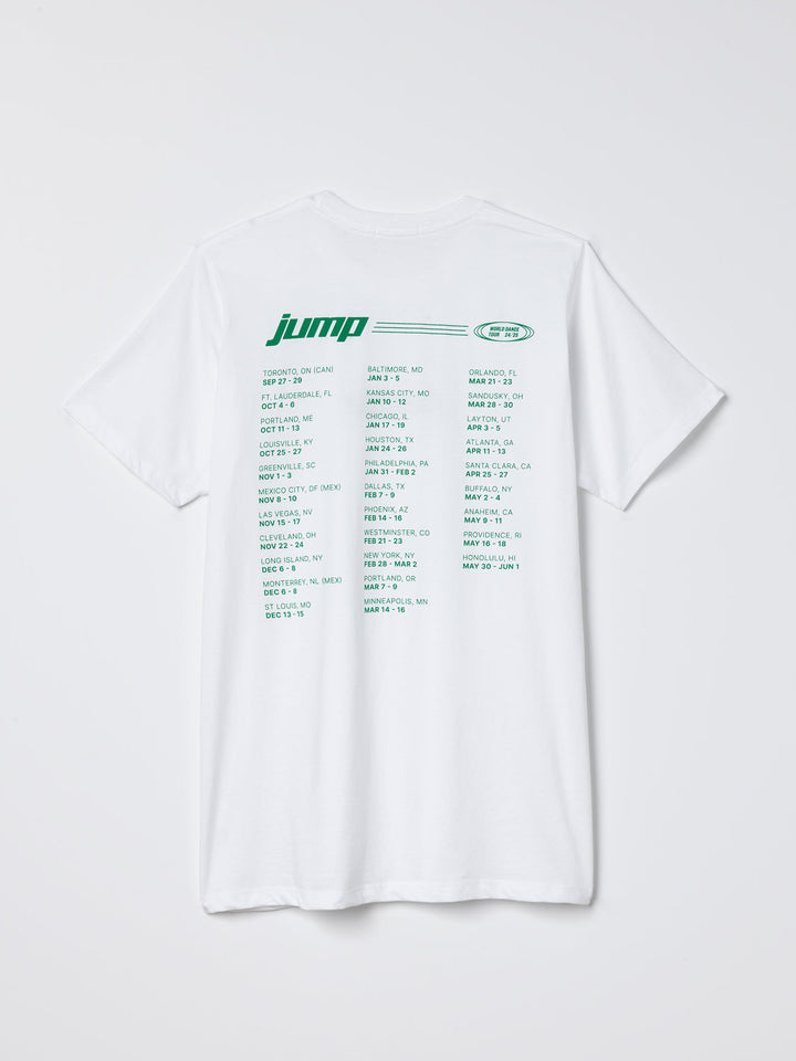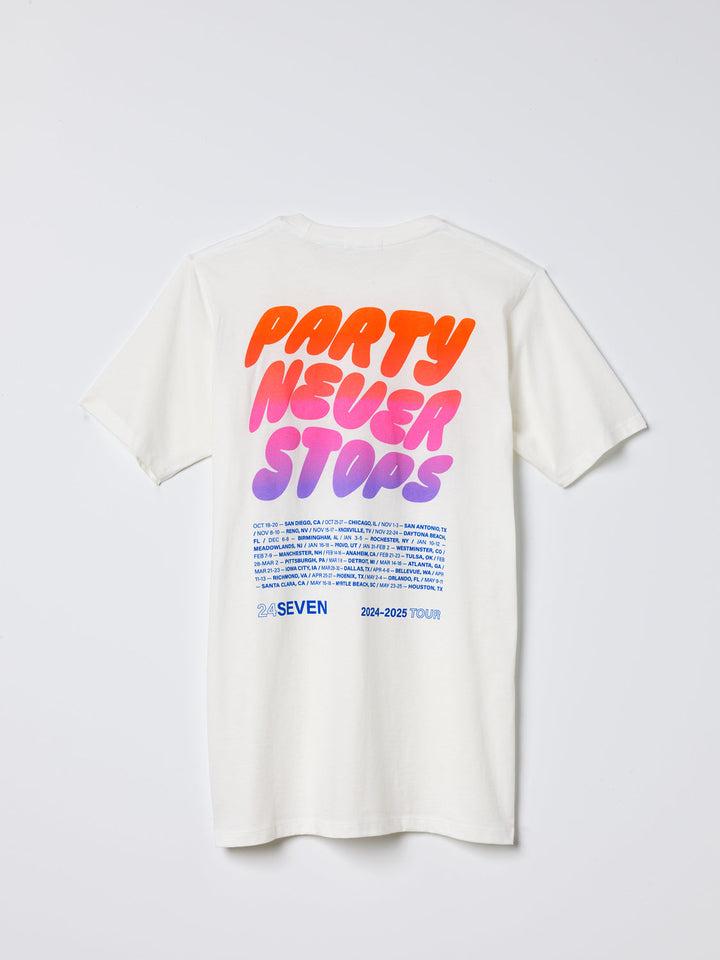 Nuestro Camiseta blanca de peso medio, diseñada con un corte ligeramente oversize y un toque vintage. Incluye las fechas de nuestra gira 2024/2025. Teñida en prenda, con enzimas y lavado con silicona para una sensación vintage, desgastada y suave. Hecha en Los Ángeles.