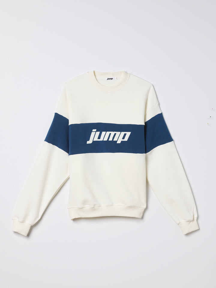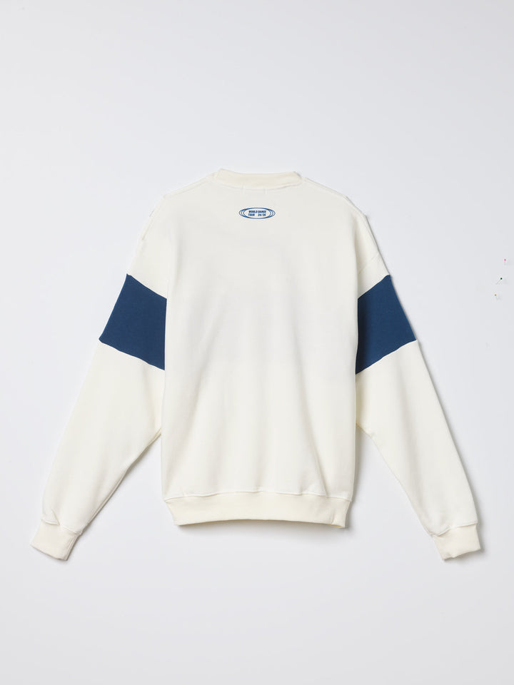 Nuestro Sudadera de cuello redondo con rayas en blanco roto y azul marino, diseñada para un corte ligeramente oversize. Presenta paneles con bloques de color. Teñida en prenda, con enzimas y lavado con silicona para una sensación vintage, desgastada y suave. Hecha en Los Ángeles.