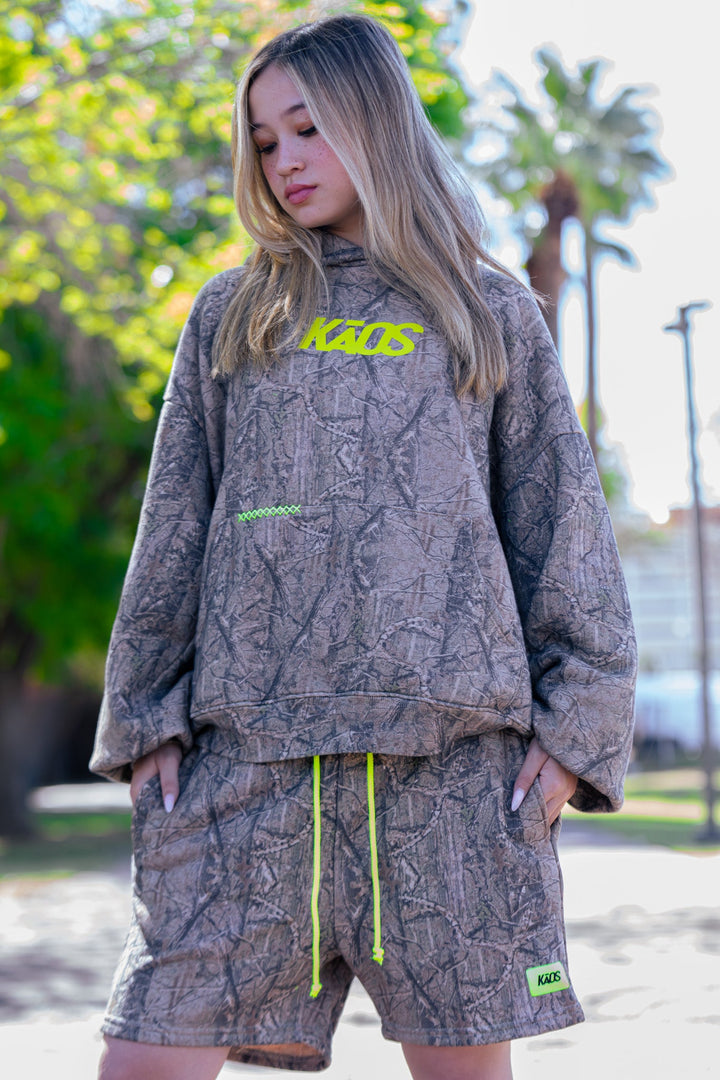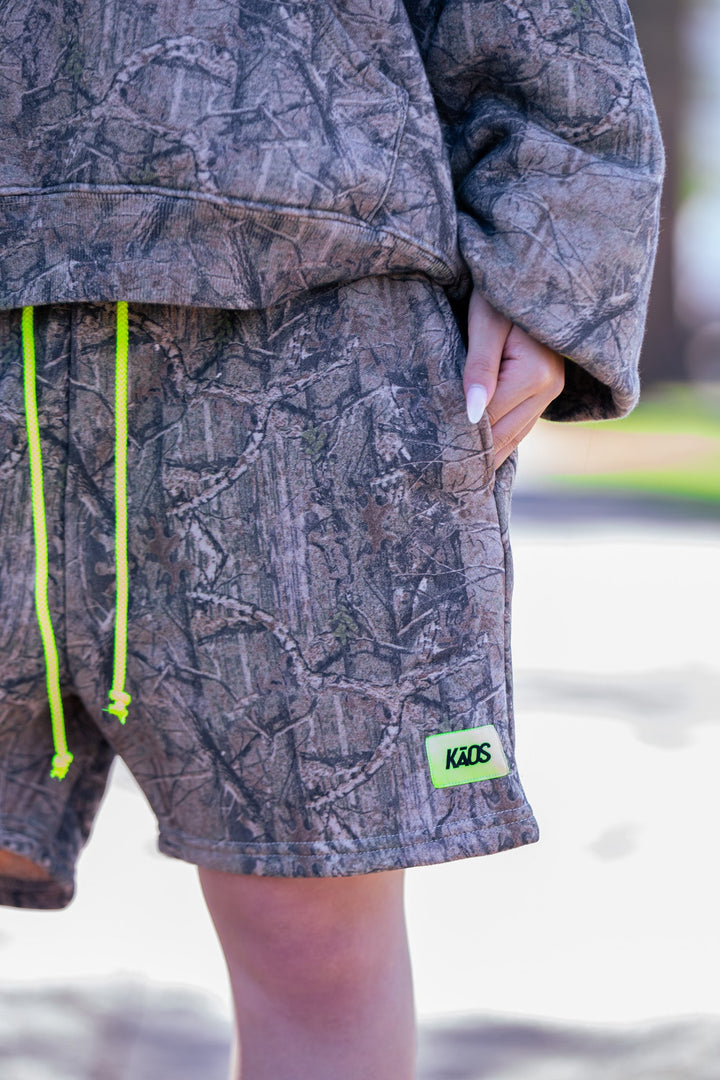 Nuestro short de camuflaje cosido es perfecto, con una silueta holgada que llega justo por encima de la rodilla. 100 % algodón hilado en anillo. Presenta un estampado de camuflaje digital con un adorno de punto X personalizado y cordón ajustable en color verde lima. Etiqueta tejida personalizada. Hecho en Los Ángeles.