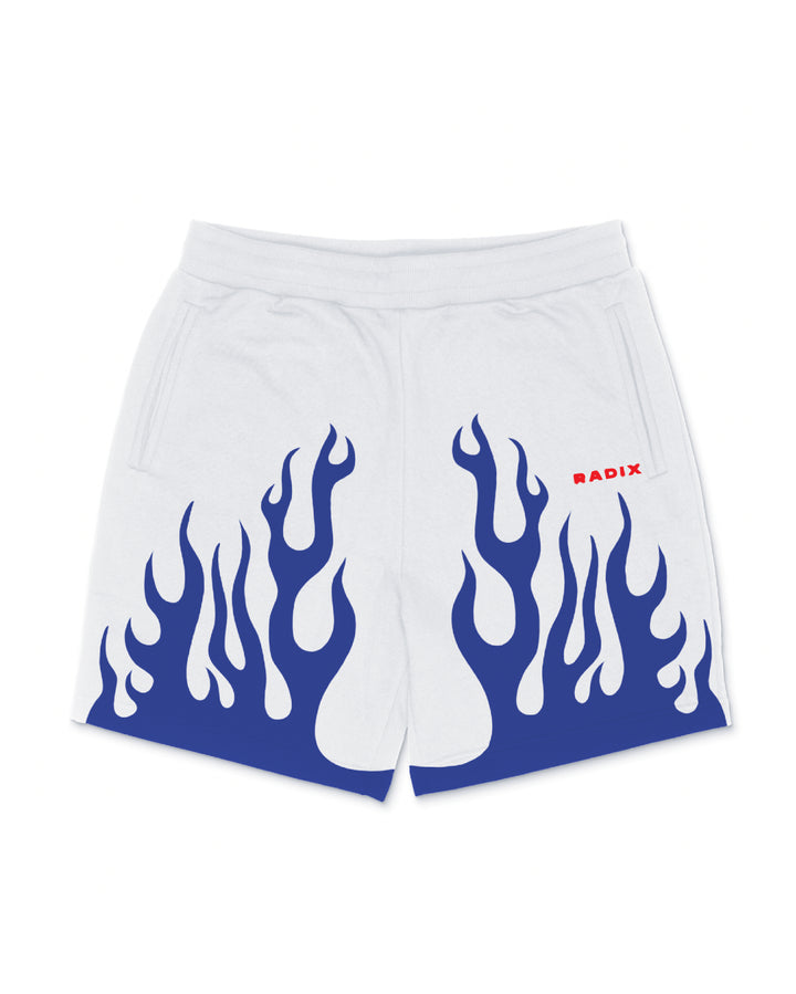 Nuestros shorts blancos con llamas azules deslumbrantes se diseñaron para ofrecer un corte holgado y extragrande. Fabricados en Los Ángeles.