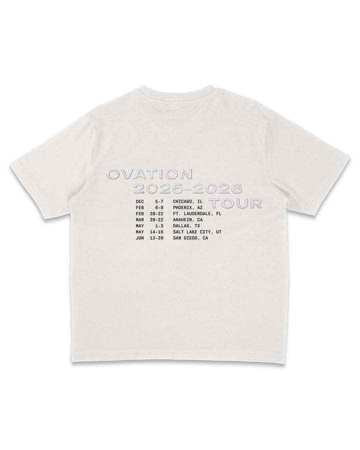 Our White mid weight tee was developed to have a slightly oversized fit and vintage feel. Features our 25/26 tour dates. Garment dye, enzyme and silicone wash for a vintage, worn, soft feel. Made in Los Angeles.