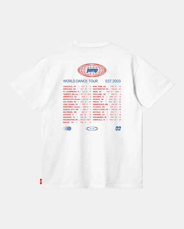 Our white mid weight tee was developed to have a slightly oversized fit and vintage feel. Features our 25/26 tour dates. Garment dye, enzyme and silicone wash for a vintage,worn, soft feel. Made in Los Angeles.